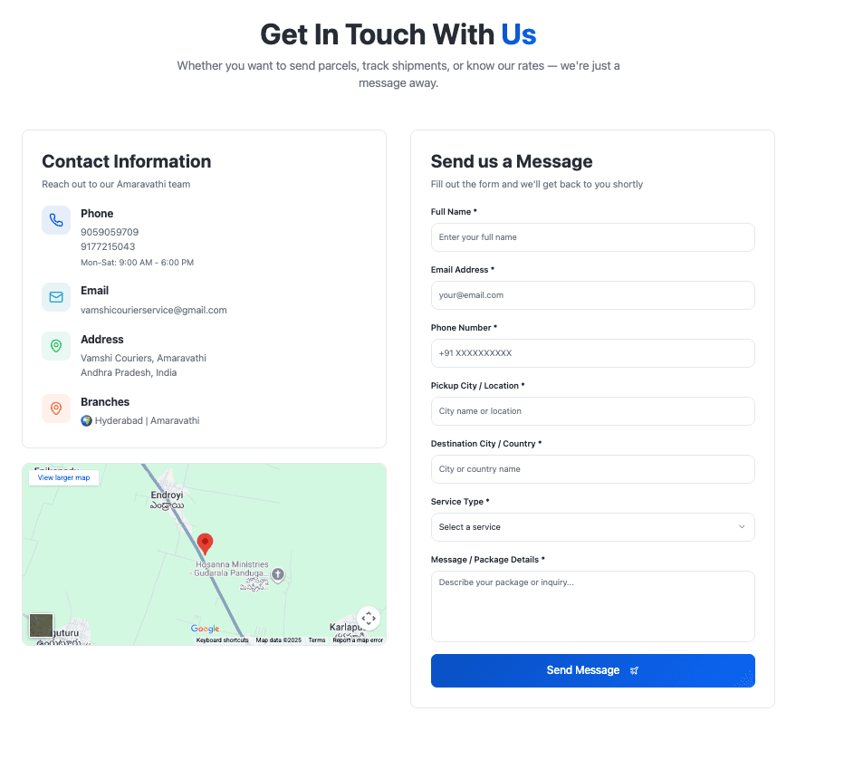 Vamshi Couriers App is a modern courier tracking and service management platform designed to enhance customer experience with real-time tracking, automated updates, and a smooth booking workflow. Built with a clean UI, fast performance, and mobile-friendly design, the platform supports hassle-free courier operations for customers and the company.